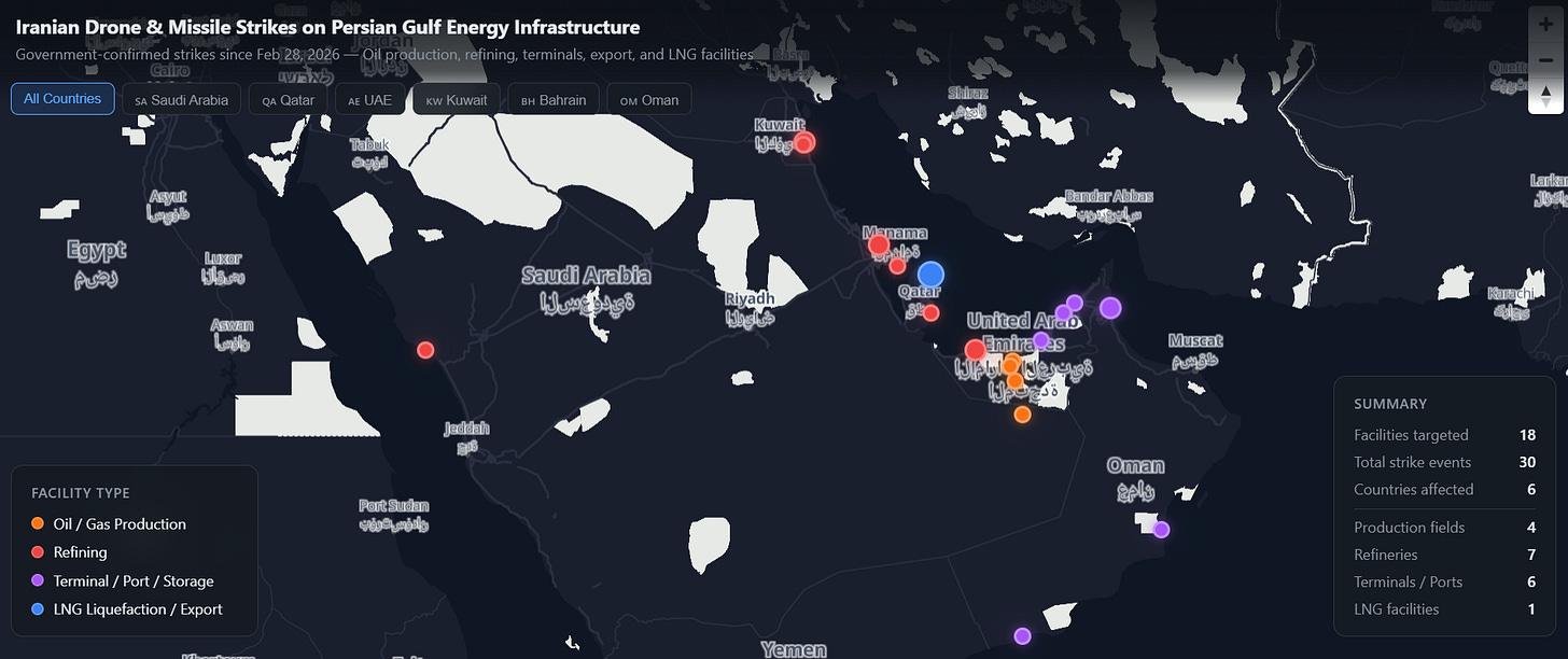 We asked Perplexity AI to prepare a map of the oil production, refining and terminal facilities, as well as the LNG liquefaction and export facilities, which have been struck by Iranian drones or missiles since the war began. It identified 30 strike events at 18 facilities in six different Persian Gulf neighbors: