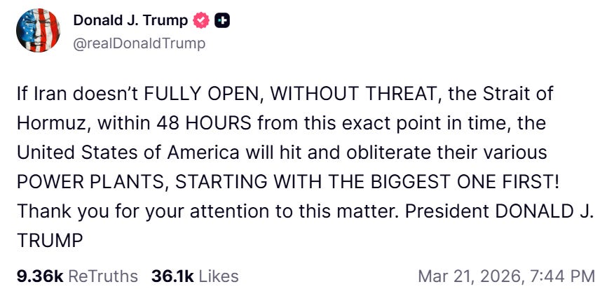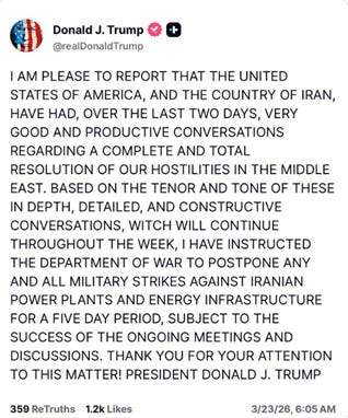 Events are moving quickly. This morning, Trump posted the below on Truth Social: