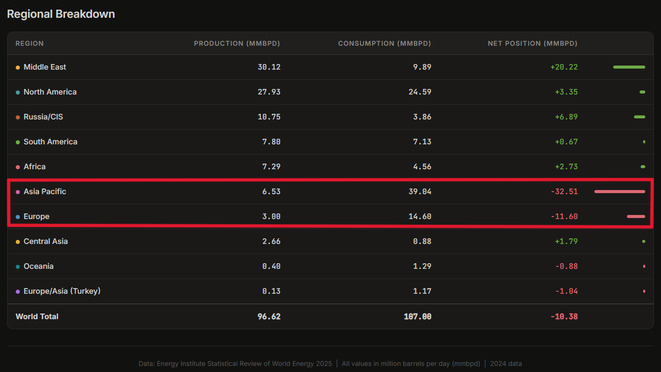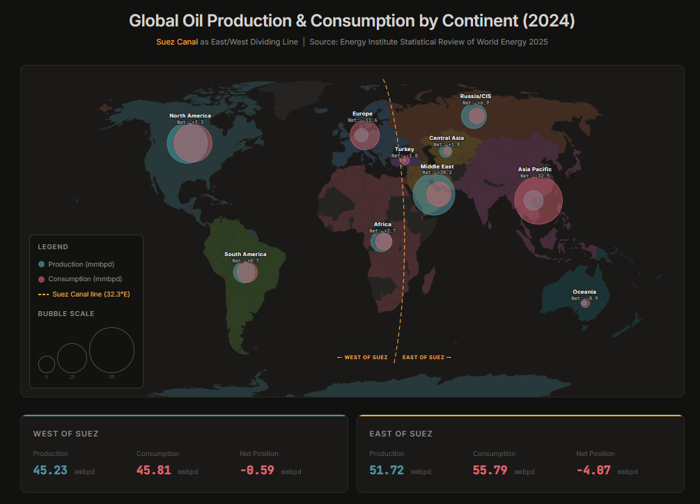 We had Perplexity prepare a map showing global oil production and consumption by continent, separating the production and consumption into “East versus West” of the Suez Canal. The continents where the consumption bubbles in pink exceed the production bubbles in blue by a large margin are clearly in a bad position.
