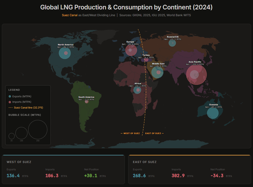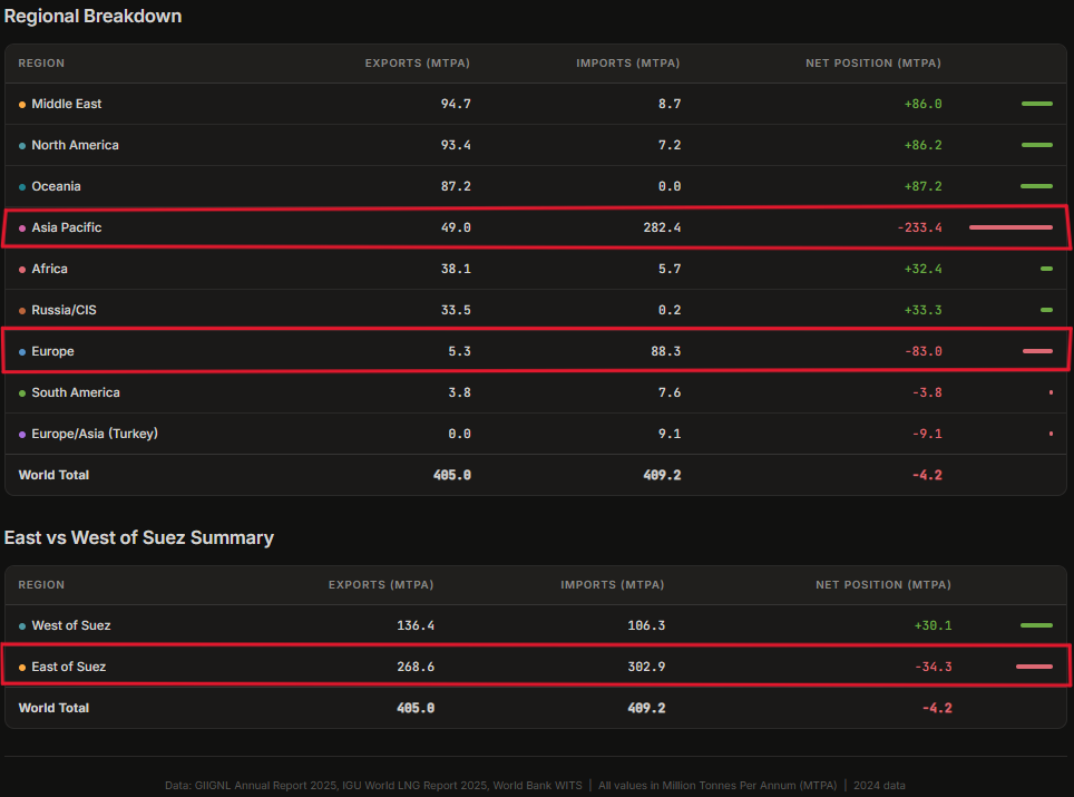 Here again, the regional comparison shows very clearly who is long and who is short LNG imports versus exports. The gap for “East of Suez” is even greater for natural gas than with crude oil.