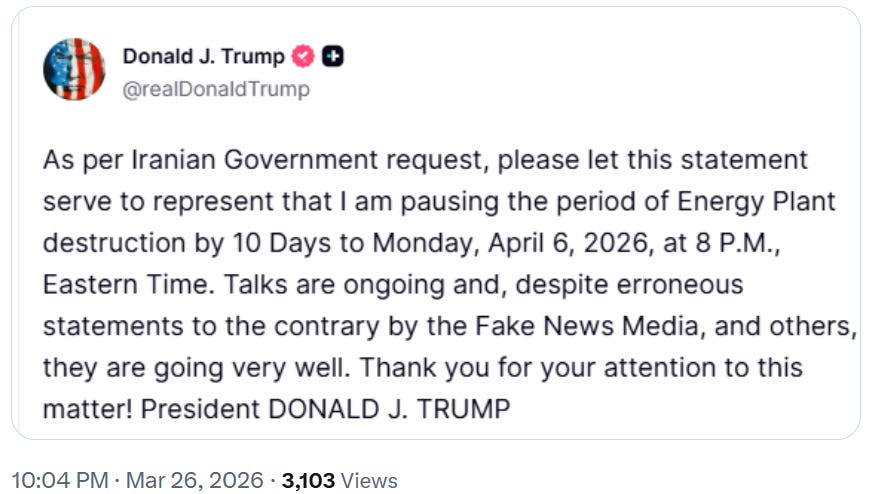 Before Trump’s first deadline extension could expire on March 28th (a weekend, no doubt in relation to global oil and stock markets), he extended it again, attributing the move to a request by Iranian government authorities.