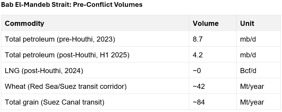 Starting in the fall of 2023, Houthi attacks threatened and rerouted significant volumes of global shipping traffic through Bab El-Mandeb. Prior to October 2023, ~9mmbpd of crude oil and refined products (~9% of global seaborne) and nearly 10 million cubic meters of LNG (about 8% of global LNG trade) transited the Strait each day. Since the attacks, LNG volumes have been practically reduced to zero, and crude oil shipments down to around 4-5mmbpd.