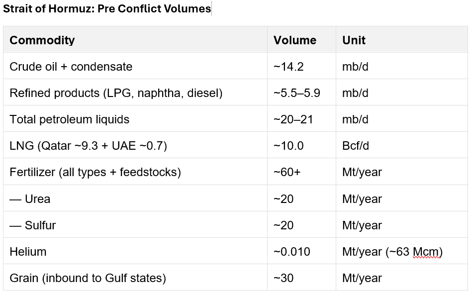 And energy products are not the only key global commodities at stake in this scenario. We asked Perplexity AI to prepare tables showing pre-conflict volumes of key commodities passing through the Straits of Hormuz and the Bab El-Mandeb.