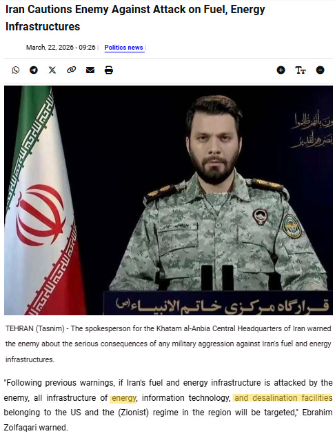 After Trump’s 48-hour ultimatum on Saturday evening March 21, a man whose face has regularly appeared over the last few weeks issued Iran’s response via Tasnim News Agency, the Iranian propaganda outlet of the IRGC. The specific targets he listed cemented our view of the war’s second major fulcrum.