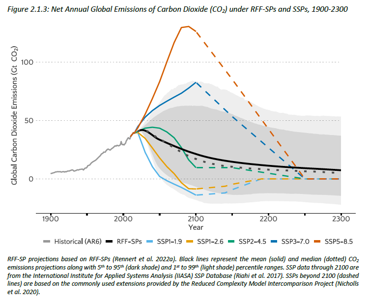 We have hypothesized that more than two decades of fear mongering over runaway “global warming” then “climate change” were rooted in population assumptions that turned out to be terribly wrong. As we noted in The Population Bombing in March 2023, we suspect this factored heavily into early UN IPCC emissions scenarios. Billions who would never existed and would never emit GHGs, using technologies that would not change much, partly explain dire projections extrapolated from “emissions scenarios” like the infamous RCP8.5 and its progeny (represented by the orange line in the graph below from that post):
