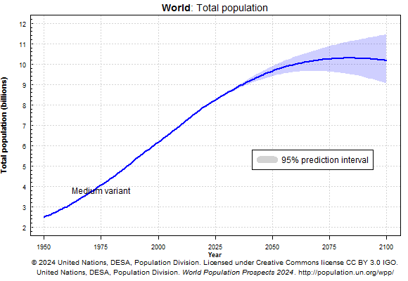 Compare the UN’s 1998 and 2024 population projection graphs above. Consider the difference: ~4 to 7 billion extra humans by the year 2100, with population continuing to rise for 50 more years in the 1998 projection. A peak in the mid-2080s at 10.3 billion in the 2024 projection.