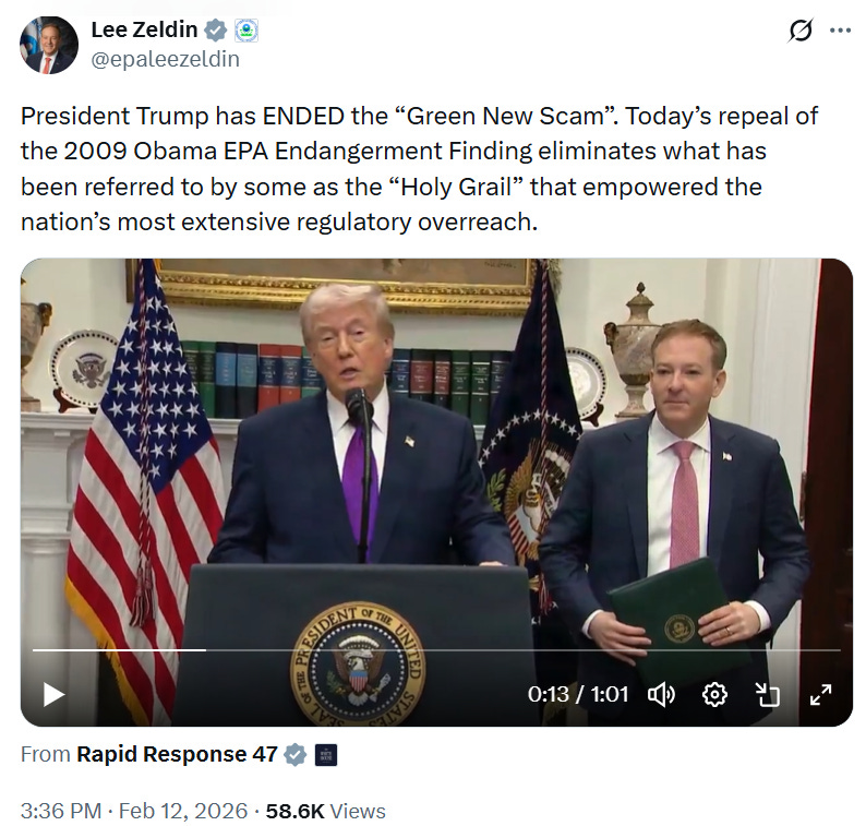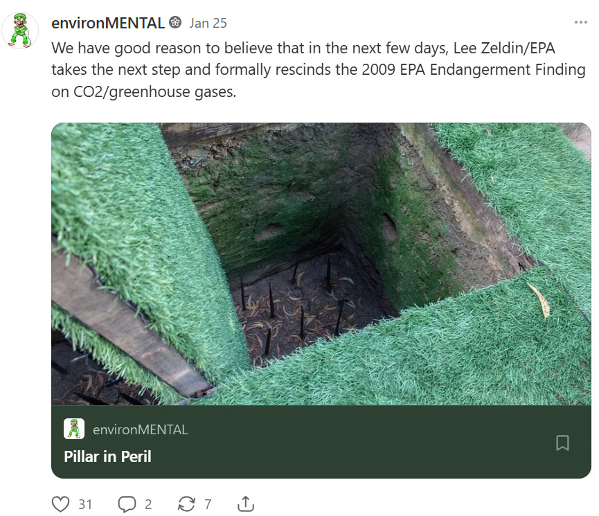 About a month ago, we received a tip that the U.S. Environmental Protection Agency (EPA) had submitted the necessary paperwork to issue the final rule to rescind the 2009 Endangerment Finding on greenhouse gases (GHG’s, including CO2) from new U.S. motor vehicles (the “EF”) to the U.S. Office of Management and Budget, a final step required prior to public release. On January 25, we posted the following on Substack Notes: